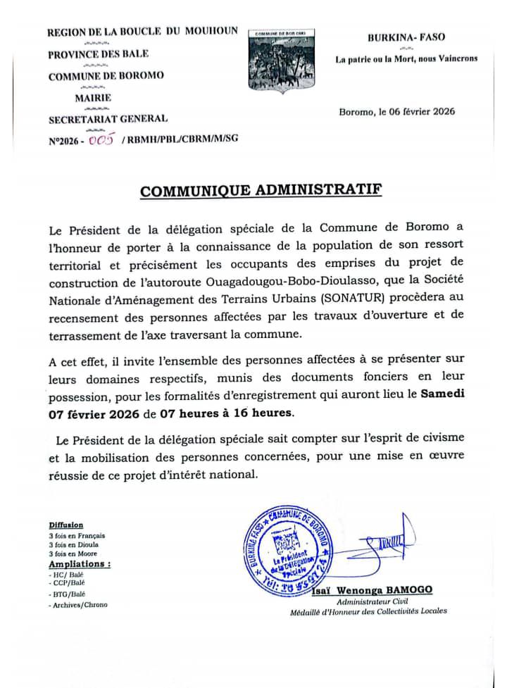 Le président de la délégation spéciale de la commune de Boromo invite les populations affectées par le projet de construction de l’autoroute Ouaga Bobo a se présenter demain samedi 07 février 2026 sur leur domaine respectif munis des documents fonciers en leur possession afin de procéder à leur recensement par la Sonatur de 7h à 16h.