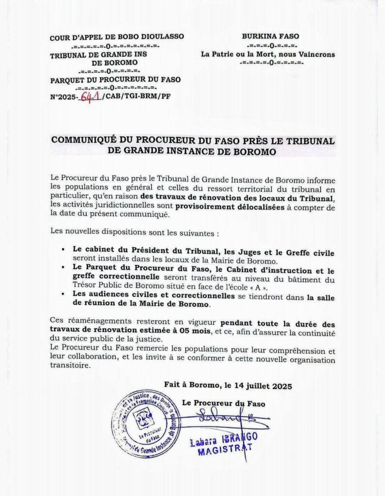 Le Procureur du Faso près le Tribunal de Grande Instance de Boromo informe les populations en général et celles du ressort territorial du tribunal en particulier, qu’en raison des travaux de rênovation des locaux du Tribunal, les activités juridictionnelles sont provisoirement délocalisées à compter de la date du prėsent communiqué.